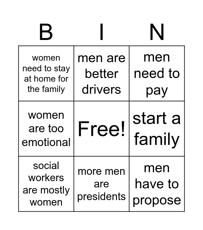 This bingo card has a free space and 8 words: start a family, men need to pay, men are better drivers, social workers are mostly women, women need to stay at home for the family, men have to propose, women are too emotional and more men are presidents.