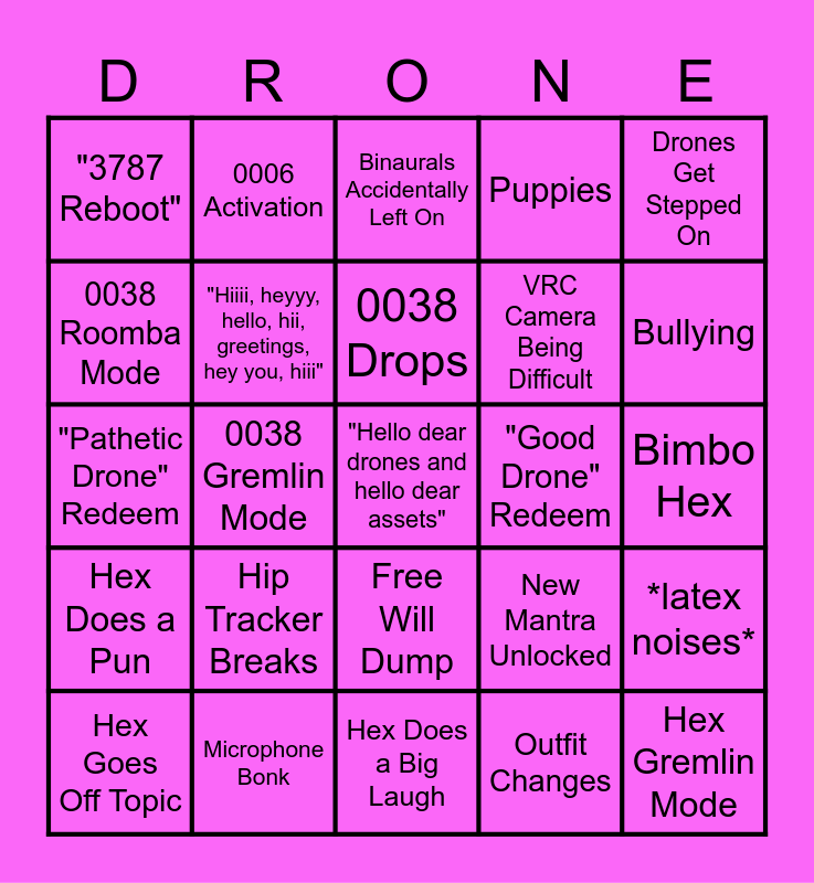 This bingo card has a free space and 24 words: Hip Tracker Breaks, Microphone Bonk, 0038 Drops, Hex Goes Off Topic, Drones Get Stepped On, "3787 Reboot", 0038 Roomba Mode, 0006 Activation, "Good Drone" Redeem, Free Will Dump, VRC Camera Being Difficult, "Pathetic Drone" Redeem, New Mantra Unlocked, *latex noises*, "Hiiii, heyyy, hello, hii, greetings, hey you, hiii", Outfit Changes, Bimbo Hex, Binaurals Accidentally Left On, Bullying, 0038 Gremlin Mode, Hex Gremlin Mode, Hex Does a Pun, Puppies and Hex Does a Big Laugh.
