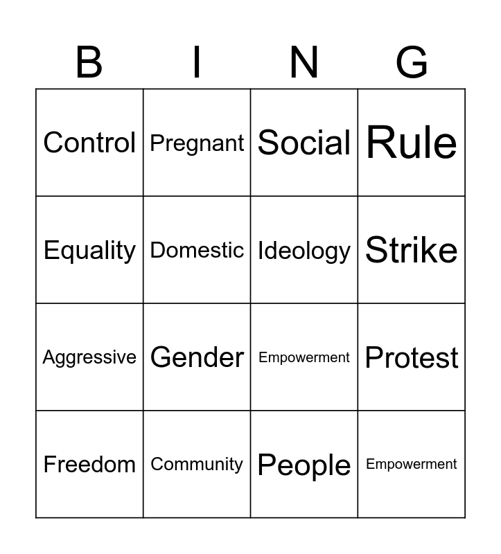 This bingo card has 30 words: Free!, Activism, Protest, Patriarchy, Control, Social, Ideology, Feminism, Community, Edlest male, People, Freedom, Fight, Work, Gender, Violence, Social system, Empowerment, Domination, Equality, Empowerment, Female, Pregnant, Aggressive, Domestic, Rule, Wrestling, System, Strike and Responsibility.