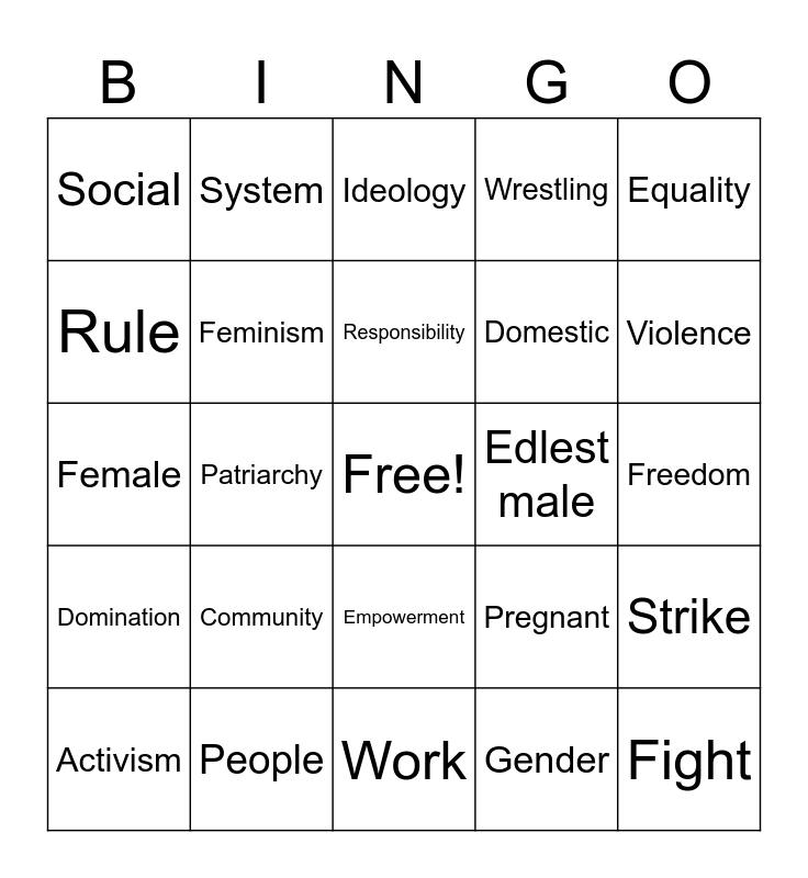 This bingo card has a free space and 29 words: Activism, Protest, Patriarchy, Control, Social, Ideology, Feminism, Community, Edlest male, People, Freedom, Fight, Work, Gender, Violence, Social system, Empowerment, Domination, Equality, Female, Pregnant, Aggressive, Domestic, Rule, Wrestling, System, Strike, Responsibility and Incredible Gassy.