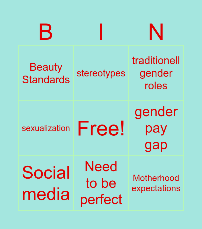 This bingo card has a free space and 8 words: gender pay gap, traditionell gender roles, stereotypes, Social media, Beauty Standards, Motherhood expectations, sexualization and Need to be perfect.