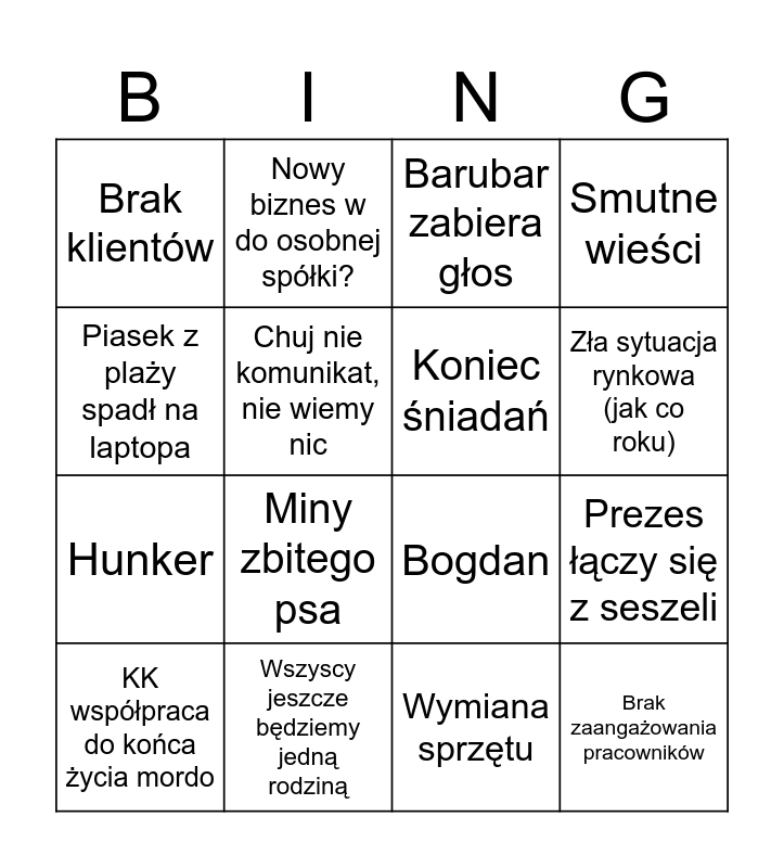 This bingo card has 16 words: Wszyscy jeszcze będziemy jedną rodziną, Prezes łączy się z seszeli, Barubar zabiera głos, Brak klientów, Hunker, Nowy biznes w do osobnej spółki?, Bogdan, Wymiana sprzętu, Piasek z plaży spadł na laptopa, Chuj nie komunikat, nie wiemy nic, KK współpraca do końca życia mordo, Smutne wieści, Miny zbitego psa, Zła sytuacja rynkowa (jak co roku), Koniec śniadań and Brak zaangażowania pracowników.