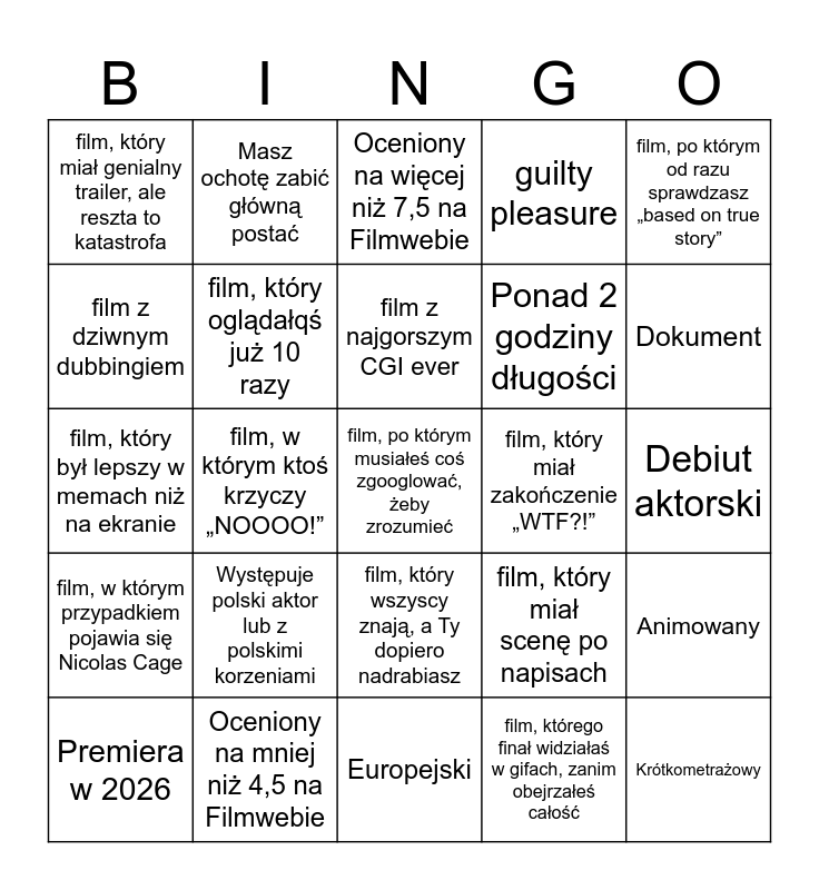 This bingo card has 35 words: Netflix, tak nudny, że zasnąłaś, tak śmieszny, że się oplułaś, film, który oglądałqś już 10 razy, film, który wszyscy znają, a Ty dopiero nadrabiasz, guilty pleasure, film z dziwnym dubbingiem, film z aktorem, którego nie cierpisz, ale i tak oglądasz, film z najgorszym CGI ever, film z twistem, który rozwalił Ci mózg, film, który był lepszy w memach niż na ekranie, film, po którym od razu sprawdzasz „based on true story”, Najlepszy z Najgorszych, film z piosenką, która zostaje w głowie na tydzień, film, który miał genialny trailer, ale reszta to katastrofa, film, który miał zakończenie „WTF?!”, film, którego finał widziałaś w gifach, zanim obejrzałeś całość, film, w którym ktoś krzyczy „NOOOO!”, film, w którym przypadkiem pojawia się Nicolas Cage, film, po którym musiałeś coś zgooglować, żeby zrozumieć, film, który miał scenę po napisach, Premiera w 2026, Animowany, Oceniony na mniej niż 4,5 na Filmwebie, Oceniony na więcej niż 7,5 na Filmwebie, Dokument, Krótkometrażowy, Od razu chcesz rewatch, Ponad 2 godziny długości, Debiut aktorski, Byłaś w kinie, Europejski, Występuje polski aktor lub z polskimi korzeniami, Masz ochotę zabić główną postać and Nie mogłaś się doczekać by obejrzeć.