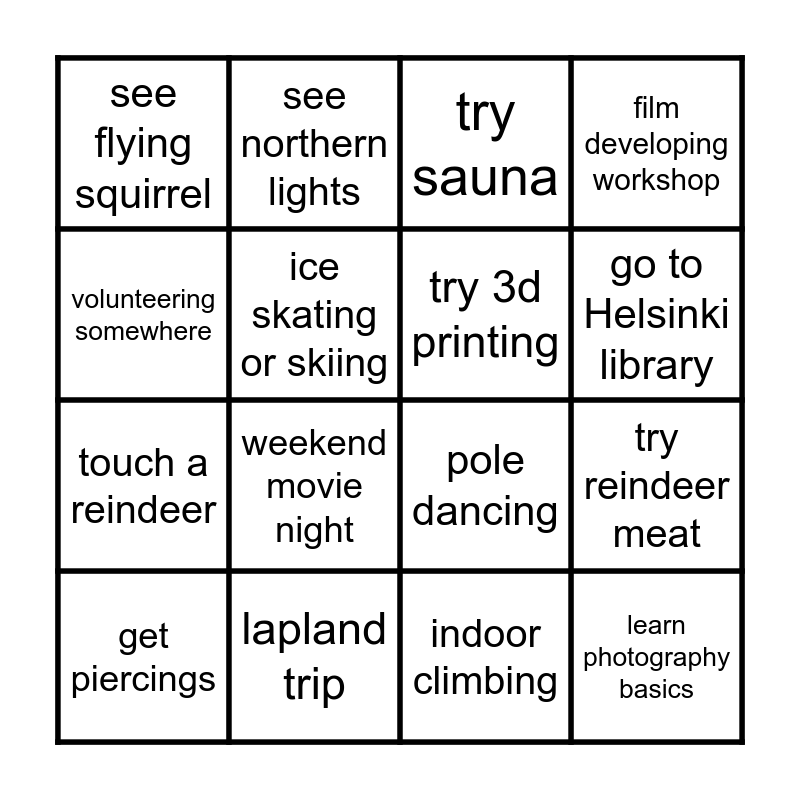 This bingo card has 16 words: lapland trip, try reindeer meat, try sauna, see flying squirrel, touch a reindeer, see northern lights, pole dancing, indoor climbing, volunteering somewhere, ice skating or skiing, get piercings, film developing workshop, weekend movie night, go to Helsinki library, try 3d printing and learn photography basics.
