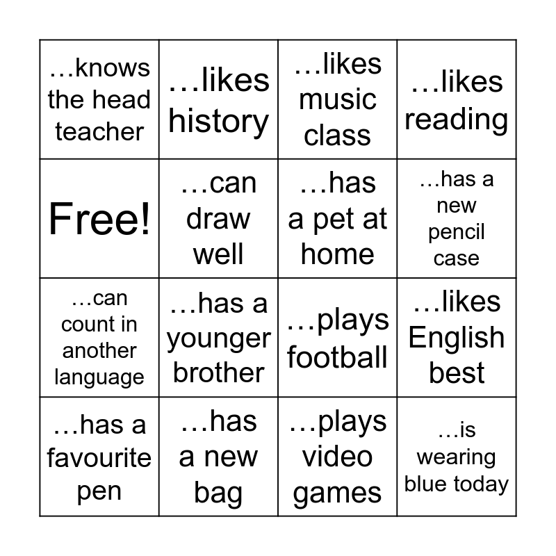 This bingo card has 16 words: …has a new bag, …likes English best, …likes music class, …knows the head teacher, …can count in another language, …likes history, …plays football, …plays video games, Free!, …can draw well, …has a favourite pen, …likes reading, …has a younger brother, …has a new pencil case, …has a pet at home and …is wearing blue today.