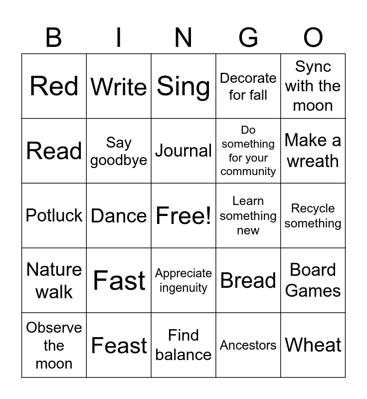 This bingo card has a free space and 24 words: Fast, Feast, Journal, Observe the moon, Sync with the moon, Red, Read, Write, Learn something new, Appreciate ingenuity, Do something for your community, Potluck, Bread, Board Games, Say goodbye, Ancestors, Recycle something, Sing, Make a wreath, Dance, Wheat, Nature walk, Decorate for fall and Find balance.