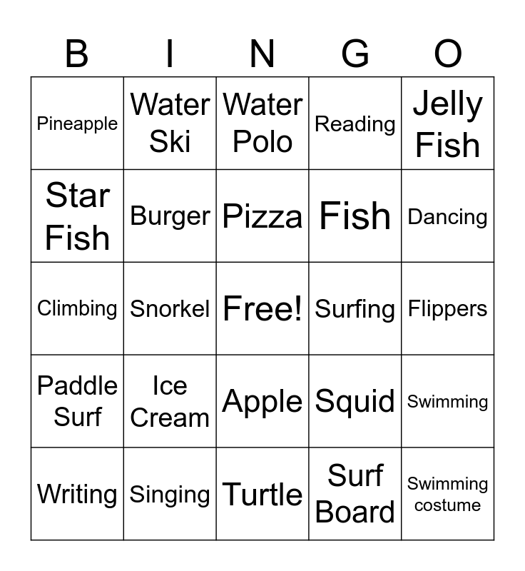 This bingo card has a free space and 27 words: Squid, Shark, Fish, Turtle, Star Fish, Water Polo, Water Ski, Paddle Surf, Surfing, Swimming, Climbing, Reading, Writing, Singing, Dancing, Studying, Burger, Pizza, Ice Cream, Pineapple, Flippers, Surf Board, Snorkel, Swimming costume, Apple, Jelly Fish and Trainers.