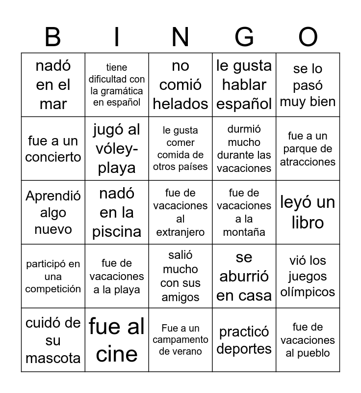 This bingo card has a free space and 29 words: cuidó de su mascota, fue a la playa, nadó en la piscina, jugó al fútbol, nadó en el mar, no comió helados, jugó al vóley-playa, fue de vacaciones a la playa, fue de vacaciones a la montaña, fue al cine, leyó un libro, fue de vacaciones al pueblo, Fue a un campamento de verano, practicó deportes, fue a un parque de atracciones, estudió durante el verano, salió mucho con sus amigos, participó en una competición, se lo pasó muy bien, Aprendió algo nuevo, se aburrió en casa, Cumplió años en verano, durmió mucho durante las vacaciones, fue a un concierto, le gusta hablar español, tiene dificultad con la gramática en español, vió los juegos olímpicos, le gusta comer comida de otros países and no le gusta la escuela.
