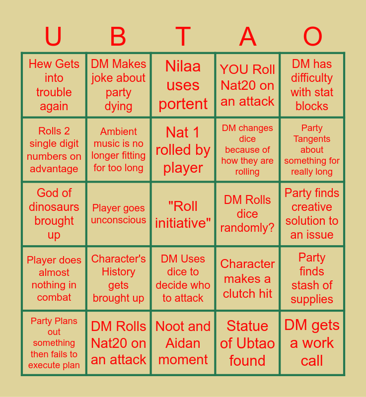 This bingo card has a free space and 24 words: Character's History gets brought up, DM Rolls Nat20 on an attack, Nat 1 rolled by player, Party Plans out something then fails to execute plan, DM has difficulty with stat blocks, Hew Gets into trouble again, Rolls 2 single digit numbers on advantage, DM Makes joke about party dying, DM Rolls dice randomly?, DM Uses dice to decide who to attack, DM changes dice because of how they are rolling, God of dinosaurs brought up, Character makes a clutch hit, Party finds stash of supplies, Ambient music is no longer fitting for too long, Statue of Ubtao found, Party finds creative solution to an issue, Nilaa uses portent, Party Tangents about something for really long, Player goes unconscious, DM gets a work call, Player does almost nothing in combat, YOU Roll Nat20 on an attack and Noot and Aidan moment.