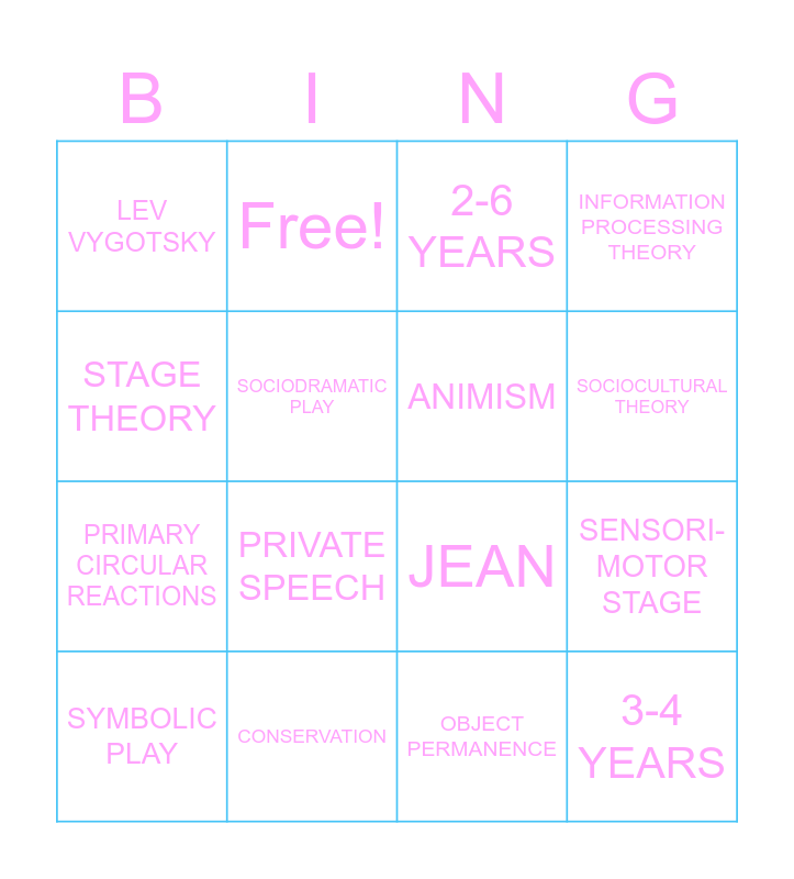 This bingo card has 19 words: JEAN, EGOCENTRISM, 2-6 YEARS, 3-4 YEARS, SENSORI-MOTOR STAGE, STAGE THEORY, OBJECT PERMANENCE, LEV VYGOTSKY, Free!, PRIMARY CIRCULAR REACTIONS, PRIVATE SPEECH, SOCIODRAMATIC PLAY, ANIMISM, CONSERVATION, SYMBOLIC PLAY, TERTIARY CIRCULAR REACTIONS, INFORMATION PROCESSING THEORY, SOCIOCULTURAL THEORY and PREOPERATIONAL STAGE.