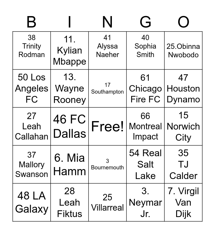 This bingo card has a free space and 90 words: 1 Arsenal, 2 Aston Villa, 3 Bournemouth, 4 Brighton & Hove Albion, 5 Burnley, 6 Chelsea, 7 Crystal Palace, 9 Everton, 10 Leicester City, 11 Liverpool, 12 Manchester City, 13 Manchester United, 14 Newcastle United, 15 Norwich City, 16 Sheffield United, 17 Southampton, 19 Tottenham Hotspur, 20 Watford, 21 West Ham United, 22 Wolverhampton Wanderers, 23 Real Madrid, 24 Valencia, 25 Villarreal, 26 Barcelona, 27 Leah Callahan, 28 Leah Fiktus, 30 Kam Shafer, 31 Izzy Rosiello, 32 Ryan Wagner, 33 Will Santorelli, 34 Ryan Gainer, 35 TJ Calder, 36 Brayden Iredale, 37 Mallory Swanson, 38 Trinity Rodman, 40 Sophia Smith, 41 Alyssa Naeher, 45 Colorado Rapids, 46 FC Dallas, 47 Houston Dynamo, 48 LA Galaxy, 50 Los Angeles FC, 51 Minnesota United FC, 52 Nashville SC, 53 Portland Timbers, 54 Real Salt Lake, 55 San Jose Earthquakes, 56 Seattle Sounders FC, 57 Sporting Kansas City, 58 Vancouver Whitecaps FC, 60 Atlanta United FC, 61 Chicago Fire FC, 62 FC Cincinnati, 63 Columbus Crew SC, 64 D.C. United, 65 Inter Miami CF, 66 Montreal Impact, 67 New England Revolution, 68 New York City FC, 69 New York Red Bulls, 71 Orlando City SC, 72 Philadelphia Union, 73 Toronto FC, 74 Erling Haaland, 75 Rose Lavelle, 1. Lionel Messi, 2. Cristiano Ronaldo, 3. Neymar Jr., 4. Nick Hagglund, 5. Kevin De Bruyne, 6. Mia Hamm, 7. Virgil Van Dijk, 8. Mohamed Salah, 10. David Beckham, 11. Kylian Mbappe, 13. Wayne Rooney, 14. Evander, 15. Matt Miazga, 16. Harry Kane, 20. Roman Celentano, 21. Miles Robinson, 25.Obinna Nwobodo, 26. Beat Turpin, 27. Go Anderson!, 29. Raptors, 30. Christian Eriksen, 32. Brandi Chastain, 33. Lyndsay Horan, 39. Pele and 43. Maradona.