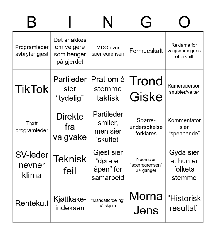 This bingo card has 29 words: Rentekutt, Valgmat / drikke nevnes, Direkte fra valgvake, “Historisk resultat”, Programleder avbryter gjest, MDG over sperregrensen, Partileder sier “tydelig”, Teknisk feil, Spørre-undersøkelse forklares, Kjøttkake-indeksen, Kommentator sier “spennende”, Partileder smiler, men sier “skuffet”, “Mandatfordeling” på skjerm, Morna Jens, Kameraperson snubler/velter, Kart over fylkesfordeling, Gjest sier “døra er åpen” for samarbeid, SV-leder nevner klima, Reklame for valgsendingens etterspill, Trøtt programleder, Noen sier “sperregrensen” 3+ ganger, Partileder takker valgkampapparatet, Trond Giske, TikTok, Formueskatt, Det snakkes om velgere som henger på gjerdet, Gyda sier at hun er folkets stemme, Prat om å stemme taktisk and Sylvi blir spurt om statsminister-rollen.