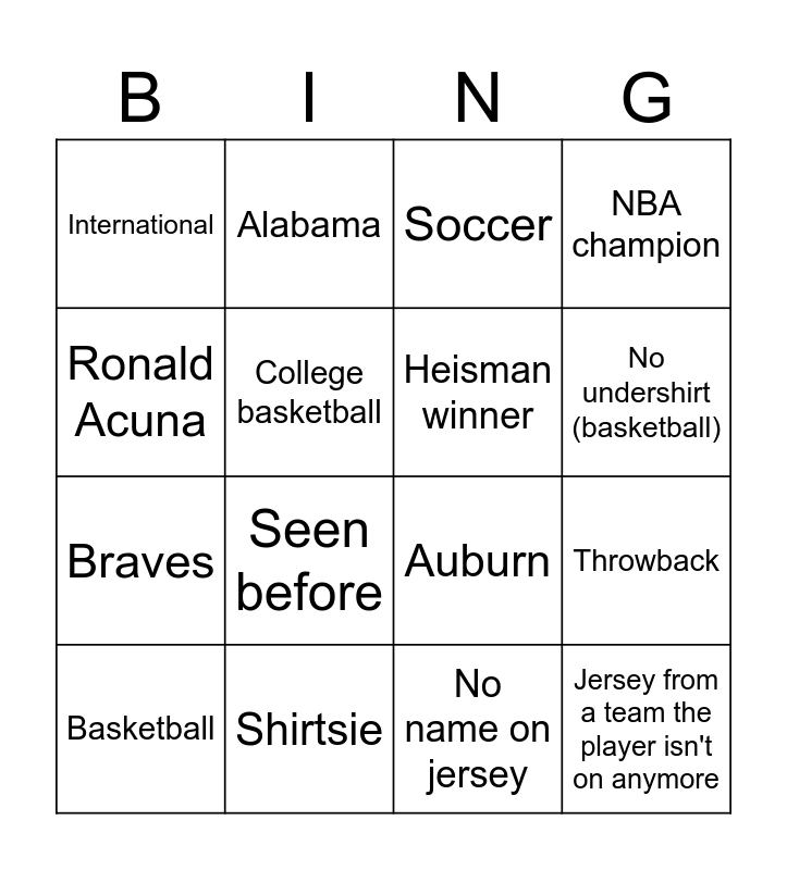 This bingo card has 16 words: Shirtsie, Throwback, Soccer, International, Braves, Alabama, Auburn, No name on jersey, Ronald Acuna, College basketball, Basketball, NBA champion, Seen before, No undershirt (basketball), Heisman winner and Jersey from a team the player isn't on anymore.