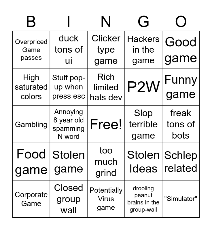 This bingo card has a free space and 24 words: Stolen game, Closed group wall, Rich limited hats dev, Corporate Game, Good game, Overpriced Game passes, High saturated colors, duck tons of ui, Slop terrible game, too much grind, P2W, Gambling, Stolen Ideas, Schlep related, Stuff pop-up when press esc, drooling peanut brains in the group-wall, freak tons of bots, Clicker type game, Funny game, Annoying 8 year old spamming N word, "Simulator", Food game, Hackers in the game and Potentially Virus game.