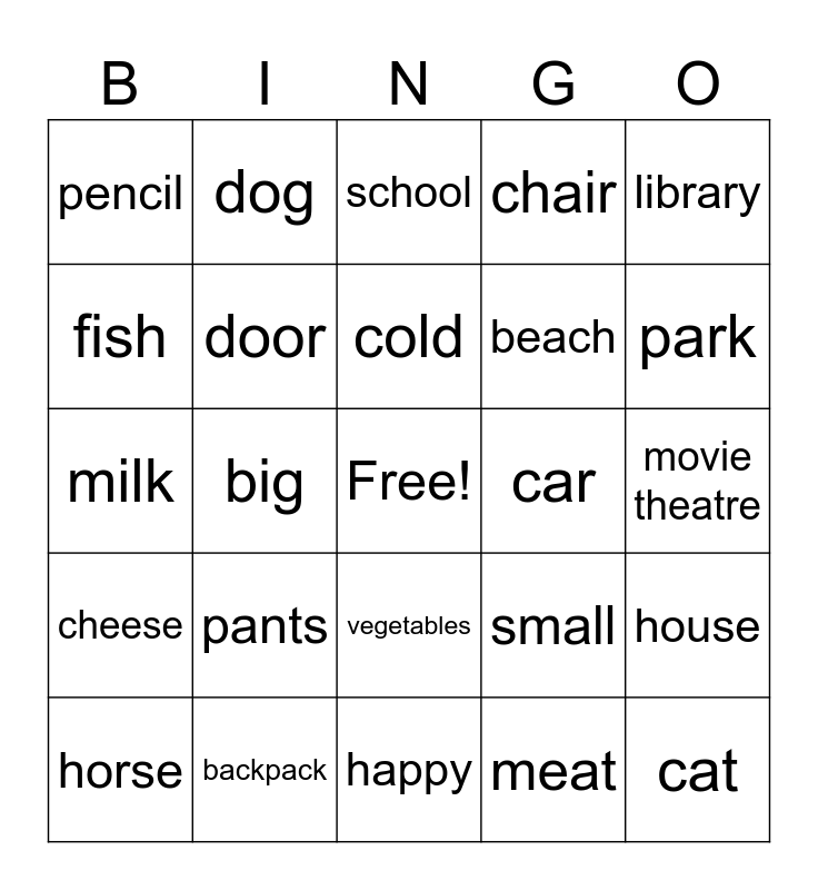 This bingo card has a free space and 24 words: horse, pants, cold, meat, library, pencil, dog, school, car, movie theatre, milk, door, small, house, fish, backpack, happy, chair, park, cheese, big, vegetables, beach and cat.