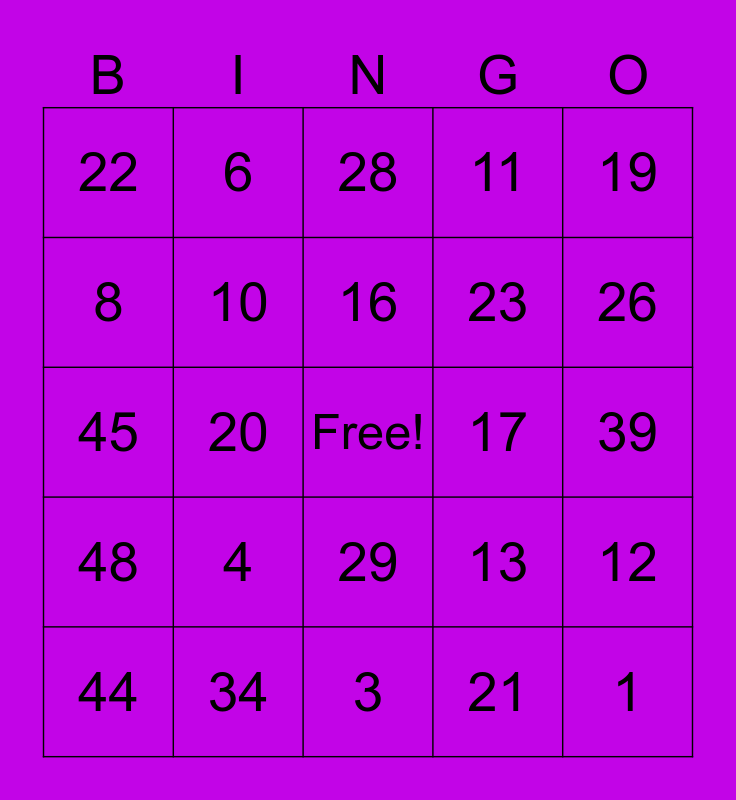 This bingo card has a free space and 50 words: 0, 1, 2, 3, 4, 5, 6, 7, 8, 9, 10, 11, 12, 13, 14, 15, 16, 17, 18, 19, 20, 21, 22, 23, 24, 25, 26, 27, 28, 29, 30, 31, 32, 33, 34, 35, 36, 37, 38, 39, 40, 41, 42, 43, 44, 45, 46, 47, 48 and 49.
