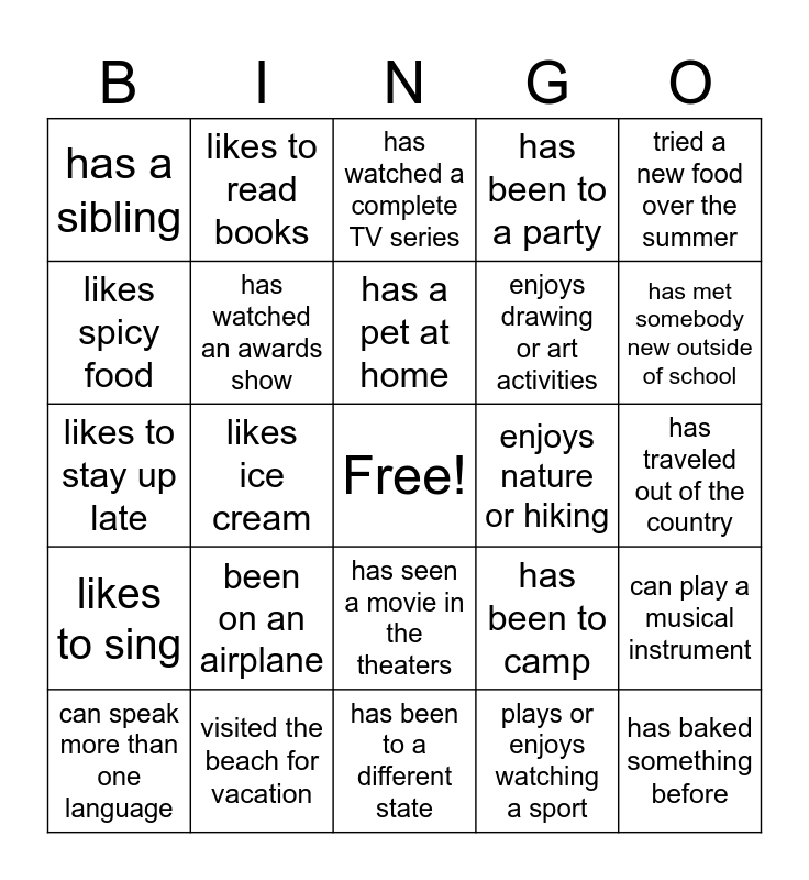 This bingo card has a free space and 24 words: been on an airplane, visited the beach for vacation, has a pet at home, can speak more than one language, tried a new food over the summer, has a sibling, likes spicy food, likes to read books, enjoys nature or hiking, has seen a movie in the theaters, enjoys drawing or art activities, likes to stay up late, has been to camp, can play a musical instrument, has watched an awards show, plays or enjoys watching a sport, has traveled out of the country, has watched a complete TV series, has met somebody new outside of school, likes ice cream, has baked something before, likes to sing, has been to a party and has been to a different state.