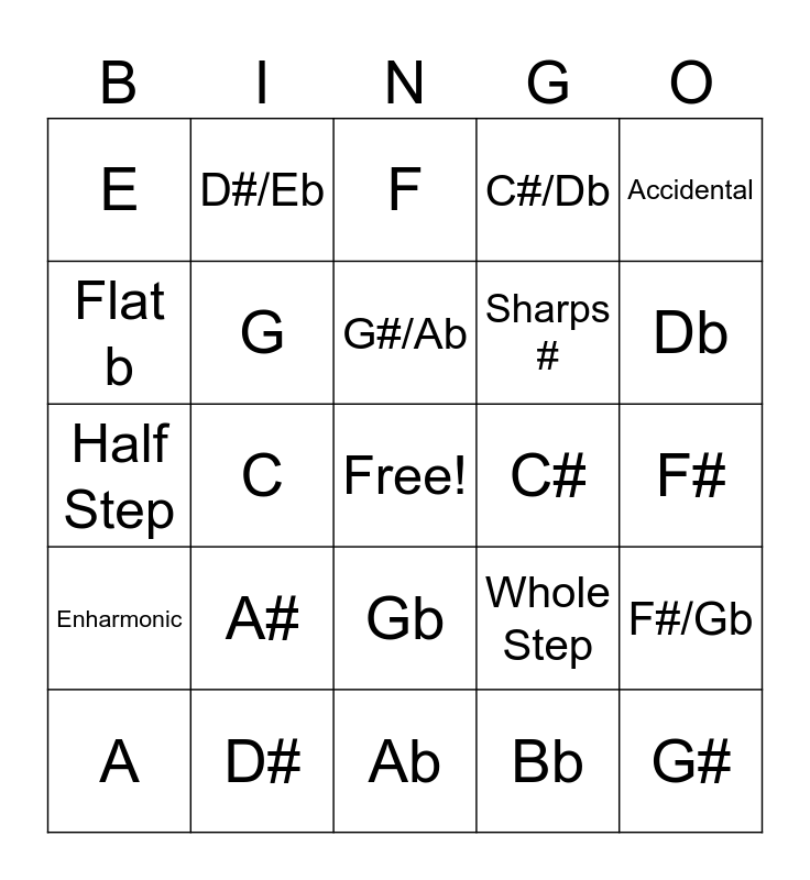 This bingo card has a free space and 29 words: A, B, C, D, E, F, G, A#, C#, D#, F#, G#, Ab, Bb, Db, Eb, Gb, Enharmonic, Accidental, Half Step, Whole Step, 88, Sharps #, Flat b, C#/Db, D#/Eb, F#/Gb, G#/Ab and A#/Bb.