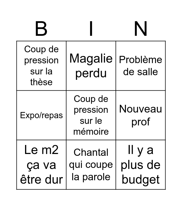 This bingo card has a free space and 9 words: Le m2 ça va être dur, Problème de salle, Magalie perdu, Expo/repas, Coup de pression sur la thèse, Nouveau prof, Il y a plus de budget, Fallait faire le terrain cette été and Chantal qui coupe la parole.