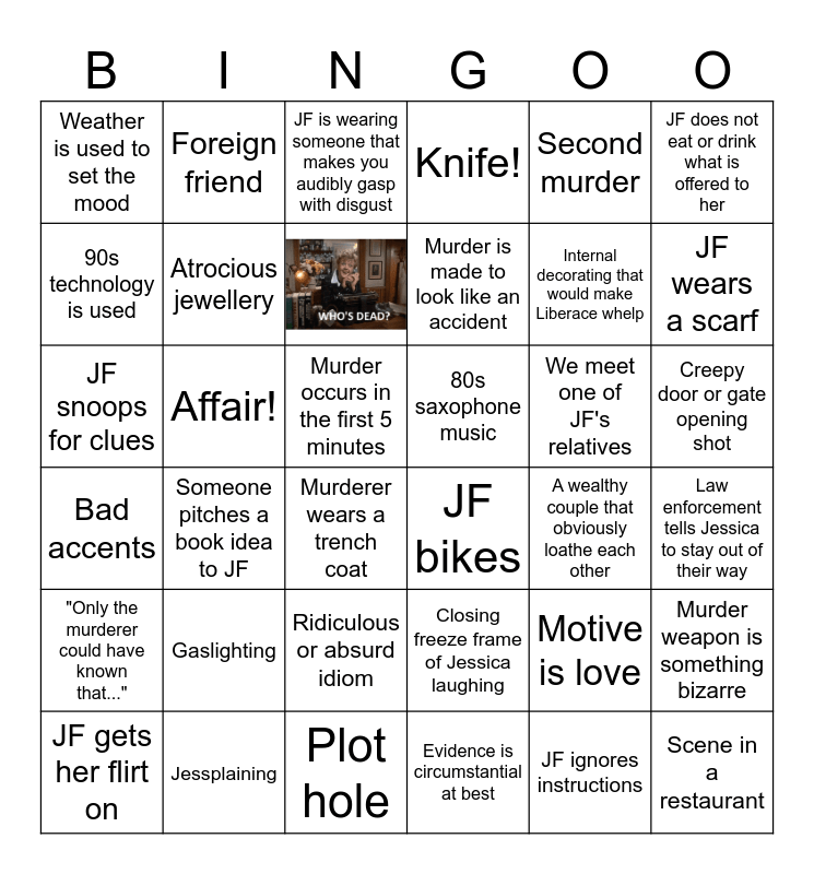 This bingo card has 1 images and 35 words: Bad accents, Someone pitches a book idea to JF, Plot hole, Murder is made to look like an accident, We meet one of JF's relatives, Creepy door or gate opening shot, Weather is used to set the mood, Jessplaining, JF is wearing someone that makes you audibly gasp with disgust, Closing freeze frame of Jessica laughing, Internal decorating that would make Liberace whelp, JF does not eat or drink what is offered to her, "Only the murderer could have known that...", Affair!, Knife!, Motive is love, Law enforcement tells Jessica to stay out of their way, 90s technology is used, Atrocious jewellery, Murderer wears a trench coat, JF bikes, A wealthy couple that obviously loathe each other, Murder weapon is something bizarre, JF snoops for clues, Foreign friend, Murder occurs in the first 5 minutes, Evidence is circumstantial at best, Second murder, JF wears a scarf, JF gets her flirt on, Gaslighting, Ridiculous or absurd idiom, 80s saxophone music, JF ignores instructions and Scene in a restaurant.