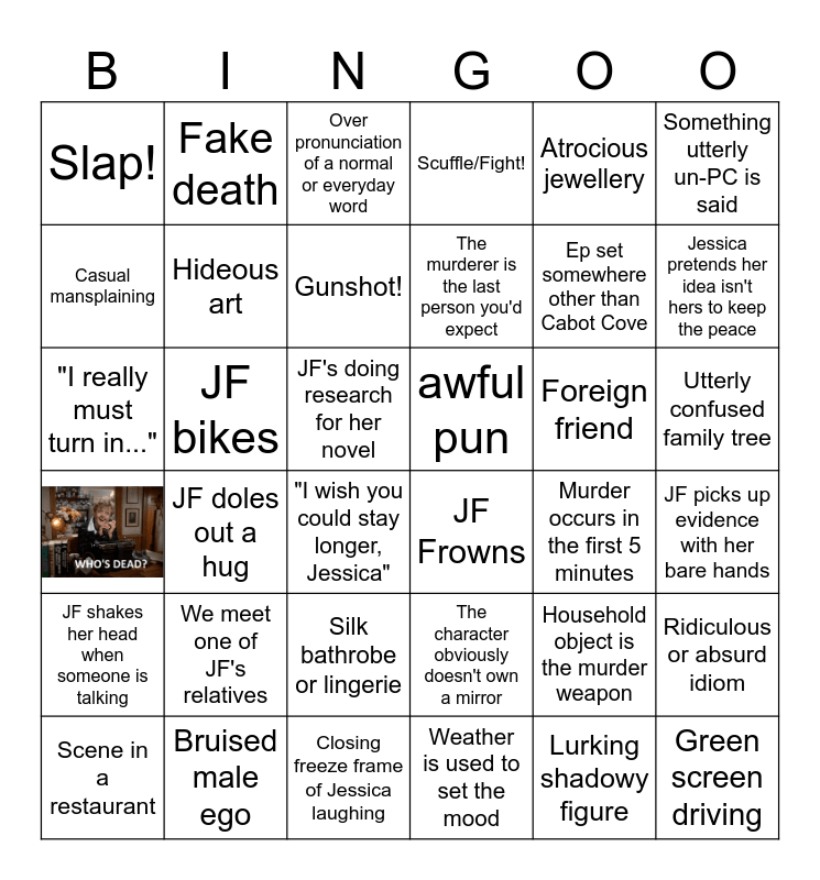 This bingo card has 1 images and 35 words: The character obviously doesn't own a mirror, Silk bathrobe or lingerie, Weather is used to set the mood, Casual mansplaining, awful pun, Hideous art, Closing freeze frame of Jessica laughing, Atrocious jewellery, Household object is the murder weapon, Jessica pretends her idea isn't hers to keep the peace, Scuffle/Fight!, Ridiculous or absurd idiom, JF bikes, The murderer is the last person you'd expect, Slap!, JF shakes her head when someone is talking, Foreign friend, "I really must turn in...", Over pronunciation of a normal or everyday word, JF's doing research for her novel, JF doles out a hug, JF Frowns, "I wish you could stay longer, Jessica", Murder occurs in the first 5 minutes, Fake death, Ep set somewhere other than Cabot Cove, Bruised male ego, Gunshot!, Something utterly un-PC is said, Green screen driving, Scene in a restaurant, JF picks up evidence with her bare hands, Utterly confused family tree, We meet one of JF's relatives and Lurking shadowy figure.
