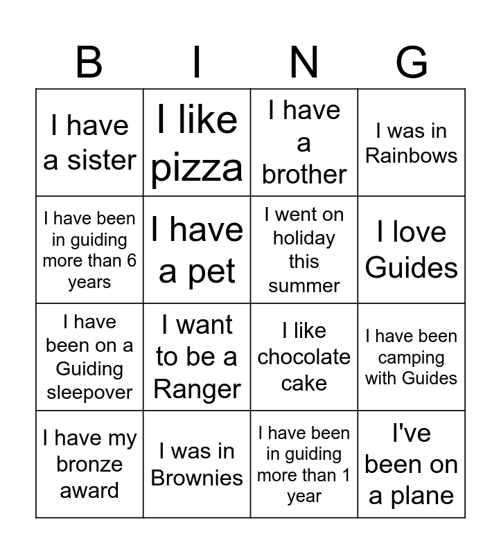 This bingo card has 16 words: I was in Brownies, I have been camping with Guides, I have a brother, I have a sister, I have been on a Guiding sleepover, I like pizza, I like chocolate cake, I have been in guiding more than 1 year, I have been in guiding more than 6 years, I have a pet, I have my bronze award, I was in Rainbows, I want to be a Ranger, I love Guides, I went on holiday this summer and I've been on a plane.
