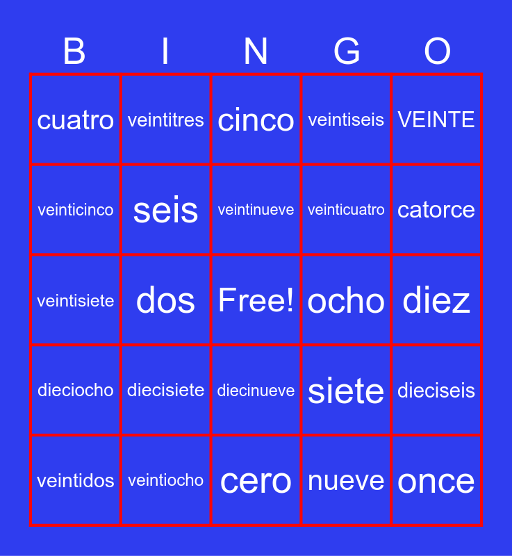 This bingo card has a free space and 31 words: cero, uno, dos, tres, cuatro, cinco, seis, siete, ocho, nueve, diez, once, doce, trece, catorce, quince, dieciseis, diecisiete, dieciocho, diecinueve, VEINTE, veintiuno, veintidos, veintitres, veinticuatro, veinticinco, veintiseis, veintisiete, veintiocho, veintinueve and TREINTA.