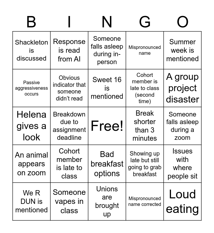 This bingo card has a free space and 25 words: Cohort member is late to class, Unions are brought up, Sweet 16 is mentioned, We R DUN is mentioned, Summer week is mentioned, Shackleton is discussed, Passive aggressiveness occurs, Response is read from AI, Break shorter than 3 minutes, Bad breakfast options, Cohort member is late to class (second time), Helena gives a look, Showing up late but still going to grab breakfast, Issues with where people sit, Obvious indicator that someone didn’t read, Seth and Addison’s political discussion going on for too long, Someone falls asleep during a zoom, Someone falls asleep during in-person, A group project disaster, Breakdown due to assignment deadline, Loud eating, Someone vapes in class, An animal appears on zoom, Mispronounced name and Mispronounced name corrected.