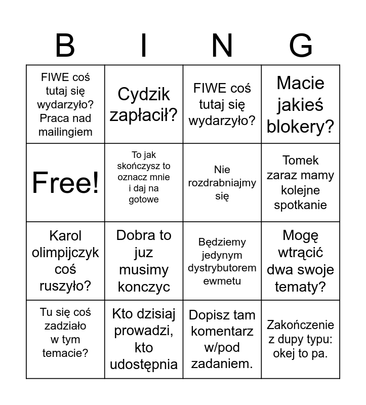 This bingo card has 16 words: Kto dzisiaj prowadzi, kto udostępnia, Mogę wtrącić dwa swoje tematy?, FIWE coś tutaj się wydarzyło?, FIWE coś tutaj się wydarzyło? Praca nad mailingiem, Karol olimpijczyk coś ruszyło?, Cydzik zapłacił?, Będziemy jedynym dystrybutorem ewmetu, Dopisz tam komentarz w/pod zadaniem., Free!, To jak skończysz to oznacz mnie i daj na gotowe, Tu się coś zadziało w tym temacie?, Macie jakieś blokery?, Dobra to juz musimy konczyc, Tomek zaraz mamy kolejne spotkanie, Nie rozdrabniajmy się and Zakończenie z dupy typu: okej to pa..