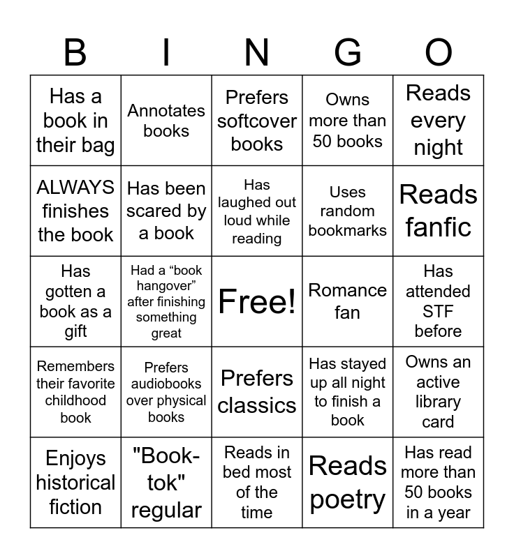 This bingo card has a free space and 69 words: Future writer, Has attended STF before, Has lent a book and never got it back, Can name one famous book quote, "Book-tok" regular, Read a book in 1 day, Owns more than 50 books, Has re-read a book over 10x, Reads every night, Prefers short stories over novels, Owns an active library card, Has cried reading a book, Has a book in their bag, Prefers softcover books, Loves sci-fi books, Had a “book hangover” after finishing something great, Prefers classics, Uses random bookmarks, Has a TBR longer than 20 books, Remembers their favorite childhood book, Romance fan, Has stayed up all night to finish a book, Reads fanfic, Has a library card, Watches the movie before reading the book, Sometimes skips to the end, Just read the cliffnotes, Chronic tote collector, Reads poetry, Read a 700+ page book, Annotates books, Prefers memoirs, E-book advocate, Has a Goodreads, Slow reader, Has fallen asleep reading, Prefers manga, Can name 3 banned books, ALWAYS finishes the book, Can read in more than one language, Prefers audiobooks over physical books, Has read more than 50 books in a year, Judges books by their covers (literally), Is currently reading more than one book at a time, Loves mythology or folklore retellings, Enjoys historical fiction, Collects special editions, Loves giving books as gifts, Has dressed up as a book character, Has been scared by a book, Has laughed out loud while reading, Buddy-reads books with a friend, Goes to author signings, Reads in bed most of the time, Reads while traveling, Has a favorite author, Reads mostly for fun, Has watched a movie or show based on a book, Has a least favorite book, Has gotten a book as a gift, Has traded books with someone, Has been devastated by a character’s death, Wanted to throw a book across the room, Loves bittersweet endings, Volunteers with a literacy or reading program, Has dragged a friend into their favorite series, Wants to make reader friends, Reads books about history more than fiction and Reads nature or science books for fun.