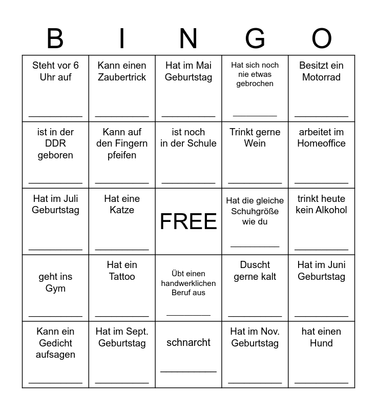 This bingo card has a free space and 39 words: Kann ein Instrument spielen __________, Ist Linkshänder __________, Kann mit den Ohren wackeln __________, Kann auf den Fingern pfeifen __________, Kann ein Gedicht aufsagen __________, Übt einen handwerklichen Beruf aus __________, ist noch in der Schule __________, kann Stricken __________, Besitzt ein Motorrad __________, geht ins Gym __________, Hat eine Katze __________, Hat sich noch nie etwas gebrochen __________, hat einen Hund __________, trinkt heute kein Alkohol __________, Hat die gleiche Schuhgröße wie du __________, Hat ein Tattoo __________, Trägt eine Uhr __________, Steht vor 6 Uhr auf __________, Kann Schlittschuh laufen __________, Duscht gerne kalt __________, ist in der DDR geboren __________, schnarcht __________, Trinkt gerne Wein __________, arbeitet im Homeoffice __________, Besitzt kein Handy __________, Hat braune Schuhe an __________, Kann ein Lied pfeifen __________, War im letzten Jahr bei einem Konzert __________, Trägt etwas Handgemachtes __________, Kann einen Zaubertrick __________, Schnarcht __________, Hat noch den Weihnachtsbaum stehen __________, Hat im Mai Geburtstag __________, Hat im Sept. Geburtstag __________, Hat im Nov. Geburtstag __________, Hat im Dez. Geburtstag __________, Hat im Juni Geburtstag __________, Hat im Juli Geburtstag __________ and Hat im März Geburtstag __________.