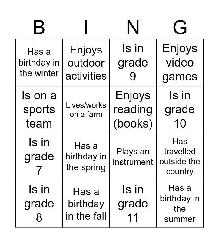 This bingo card has 16 words: Has a birthday in the fall, Has travelled outside the country, Is in grade 9, Has a birthday in the winter, Is in grade 7, Enjoys outdoor activities, Plays an instrument, Is in grade 11, Is on a sports team, Lives/works on a farm, Is in grade 8, Enjoys video games, Has a birthday in the spring, Is in grade 10, Enjoys reading (books) and Has a birthday in the summer.