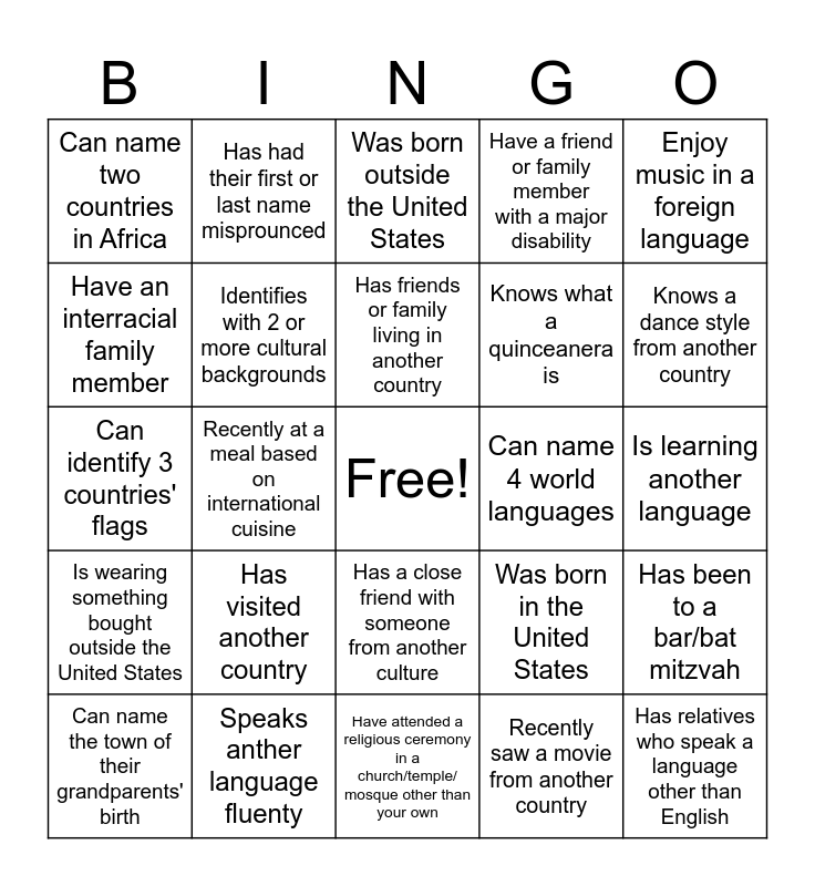 This bingo card has a free space and 24 words: Has visited another country, Speaks anther language fluenty, Has friends or family living in another country, Can name the town of their grandparents' birth, Enjoy music in a foreign language, Can name two countries in Africa, Have an interracial family member, Has had their first or last name misprounced, Can name 4 world languages, Has a close friend with someone from another culture, Knows what a quinceanera is, Can identify 3 countries' flags, Was born in the United States, Has been to a bar/bat mitzvah, Identifies with 2 or more cultural backgrounds, Recently saw a movie from another country, Is learning another language, Was born outside the United States, Knows a dance style from another country, Recently at a meal based on international cuisine, Has relatives who speak a language other than English, Is wearing something bought outside the United States, Have a friend or family member with a major disability and Have attended a religious ceremony in a church/temple/ mosque other than your own.