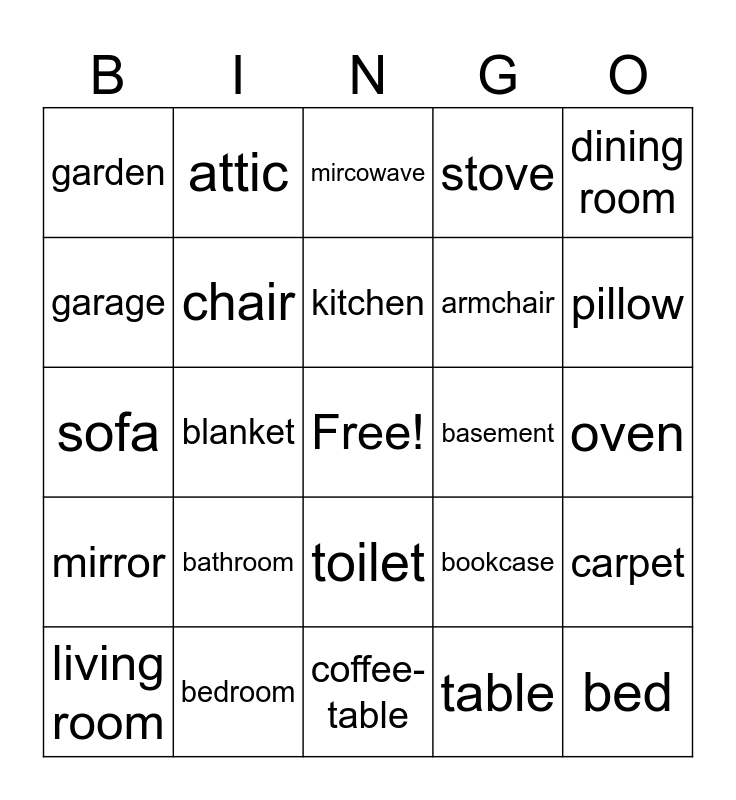 This bingo card has a free space and 24 words: bathroom, bedroom, kitchen, living room, dining room, garden, garage, attic, basement, toilet, armchair, sofa, bookcase, carpet, chair, table, oven, mircowave, pillow, blanket, bed, mirror, stove and coffee-table.