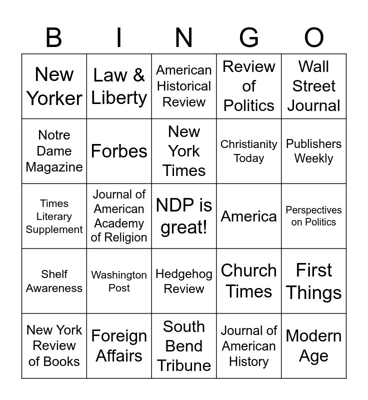 This bingo card has a free space and 24 words: Washington Post, Foreign Affairs, New York Times, New York Review of Books, Wall Street Journal, New Yorker, Notre Dame Magazine, Law & Liberty, America, Hedgehog Review, Christianity Today, Times Literary Supplement, Church Times, First Things, Forbes, Journal of American History, Perspectives on Politics, American Historical Review, Publishers Weekly, Journal of American Academy of Religion, Modern Age, Shelf Awareness, Review of Politics and South Bend Tribune.