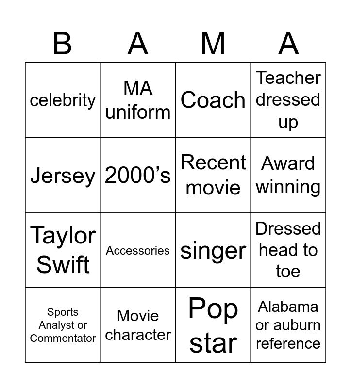 This bingo card has 16 words: Movie character, Dressed head to toe, Coach, celebrity, Taylor Swift, MA uniform, singer, Pop star, Jersey, 2000’s, Sports Analyst or Commentator, Teacher dressed up, Accessories, Award winning, Recent movie and Alabama or auburn reference.