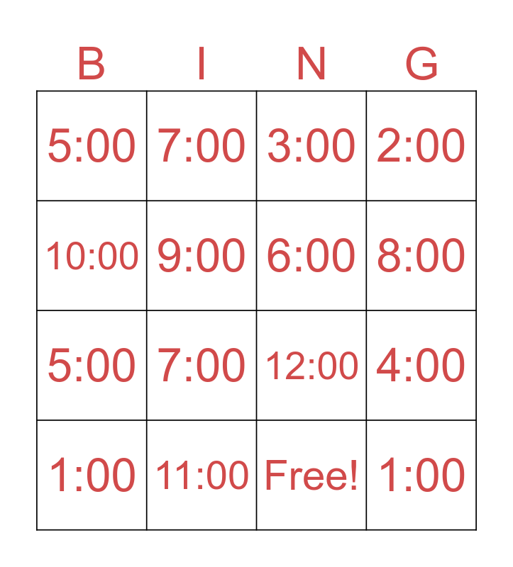 This bingo card has 17 words: Free!, 1:00, 3:00, 5:00, 7:00, 2:00, 4:00, 6:00, 8:00, 9:00, 11:00, 12:00, 10:00, 7:00, 5:00, 3:00 and 1:00.