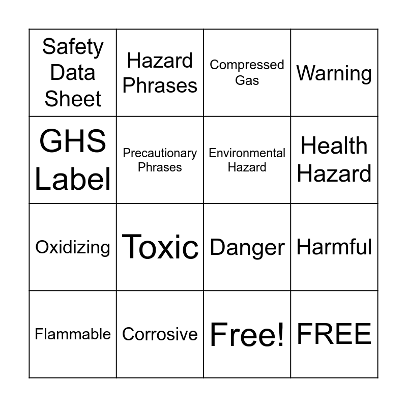 This bingo card has 17 words: Free!, Flammable, Compressed Gas, Safety Data Sheet, Toxic, Warning, Harmful, Environmental Hazard, Health Hazard, Precautionary Phrases, Corrosive, Danger, GHS Label, Hazard Phrases, Oxidizing, Explosive and FREE.