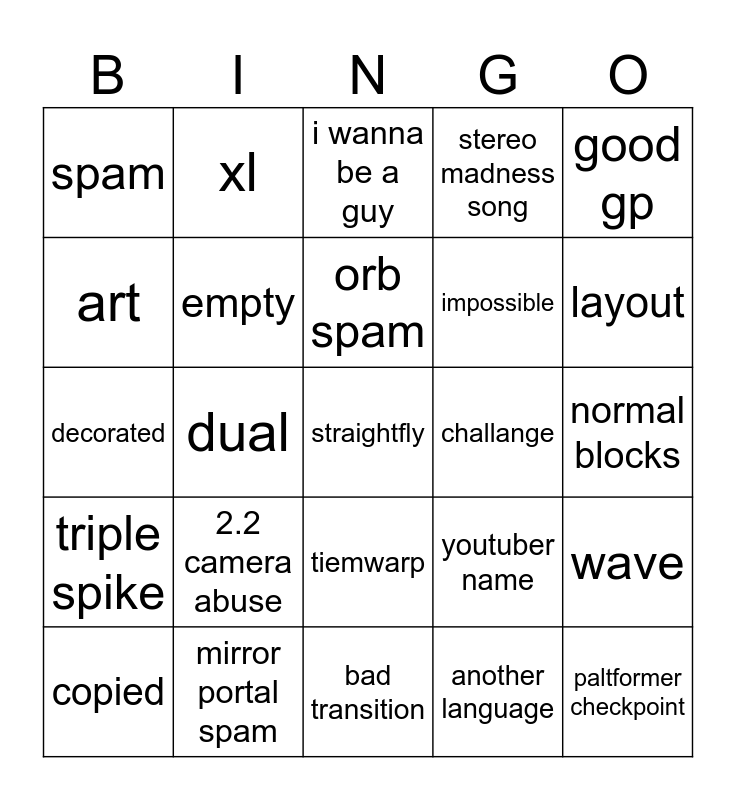 This bingo card has a free space and 24 words: 2.2 camera abuse, mirror portal spam, orb spam, copied, good gp, spam, art, xl, challange, tiemwarp, impossible, decorated, youtuber name, wave, empty, another language, normal blocks, i wanna be a guy, layout, dual, paltformer checkpoint, triple spike, stereo madness song and bad transition.