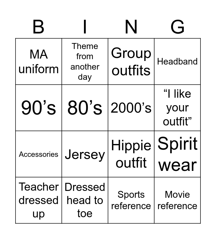 This bingo card has 16 words: Dressed head to toe, Spirit wear, Group outfits, MA uniform, Accessories, Theme from another day, Hippie outfit, Sports reference, 90’s, 80’s, Teacher dressed up, Headband, Jersey, “I like your outfit”, 2000’s and Movie reference.