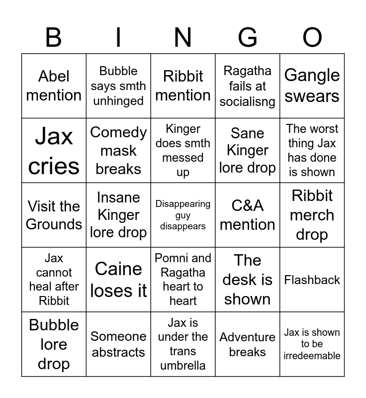 This bingo card has a free space and 24 words: Caine loses it, Someone abstracts, Kinger does smth messed up, Bubble lore drop, Gangle swears, Abel mention, Jax cries, Bubble says smth unhinged, C&A mention, Pomni and Ragatha heart to heart, Sane Kinger lore drop, Visit the Grounds, The desk is shown, Flashback, Comedy mask breaks, Adventure breaks, Ribbit merch drop, Ribbit mention, The worst thing Jax has done is shown, Insane Kinger lore drop, Jax is shown to be irredeemable, Jax cannot heal after Ribbit, Ragatha fails at socialisng and Jax is under the trans umbrella.
