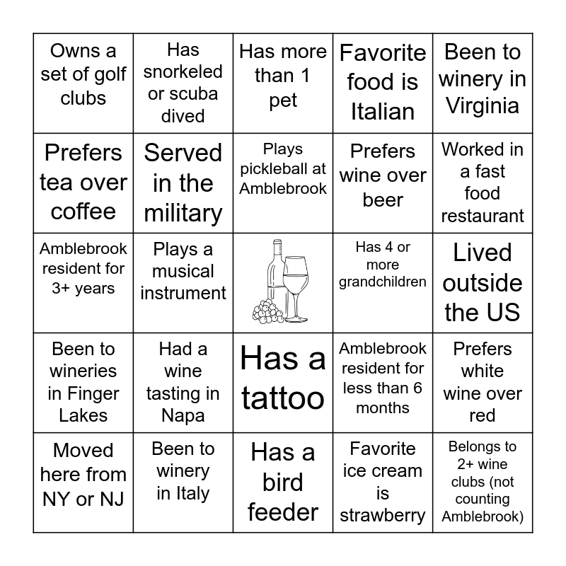 This bingo card has a free space and 24 words: Had a wine tasting in Napa, Been to winery in Italy, Plays pickleball at Amblebrook, Moved here from NY or NJ, Been to winery in Virginia, Owns a set of golf clubs, Prefers tea over coffee, Has snorkeled or scuba dived, Has 4 or more grandchildren, Has a tattoo, Prefers wine over beer, Amblebrook resident for 3+ years, Amblebrook resident for less than 6 months, Prefers white wine over red, Served in the military, Favorite ice cream is strawberry, Lived outside the US, Has more than 1 pet, Worked in a fast food restaurant, Plays a musical instrument, Belongs to 2+ wine clubs (not counting Amblebrook), Been to wineries in Finger Lakes, Favorite food is Italian and Has a bird feeder.