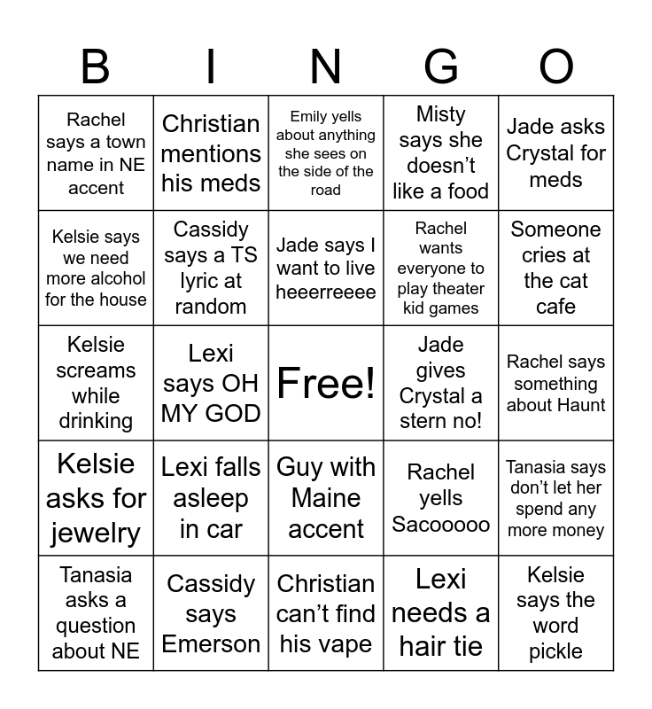 This bingo card has a free space and 24 words: Lexi falls asleep in car, Cassidy says Emerson, Jade says I want to live heeerreeee, Tanasia asks a question about NE, Jade asks Crystal for meds, Rachel says a town name in NE accent, Kelsie says we need more alcohol for the house, Christian mentions his meds, Jade gives Crystal a stern no!, Guy with Maine accent, Rachel wants everyone to play theater kid games, Kelsie screams while drinking, Rachel yells Sacooooo, Tanasia says don’t let her spend any more money, Cassidy says a TS lyric at random, Lexi needs a hair tie, Rachel says something about Haunt, Emily yells about anything she sees on the side of the road, Someone cries at the cat cafe, Lexi says OH MY GOD, Kelsie says the word pickle, Kelsie asks for jewelry, Misty says she doesn’t like a food and Christian can’t find his vape.