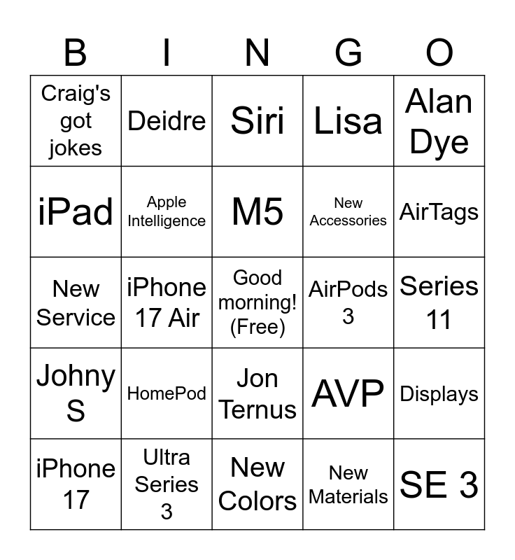 This bingo card has a free space and 29 words: iPhone 17, iPhone 17 Pro, iPhone 17 Air, One More Thing, Craig's got jokes, Siri, Apple Intelligence, HomePod, AirPods 3, Ultra Series 3, Series 11, SE 3, New Colors, New Materials, AirTags, Joz, Jon Ternus, Johny S, Alan Dye, New Service, AVP, LLMs, New Accessories, iPad, Lisa, Deidre, Displays, M5 and Gemini.