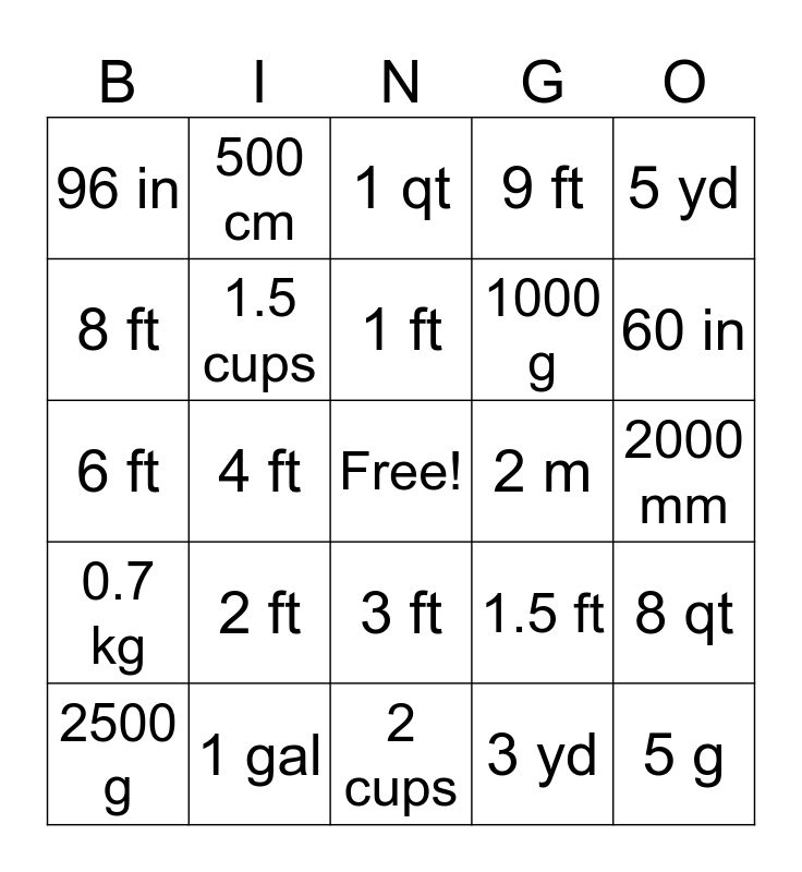 This bingo card has a free space and 24 words: 2 ft, 1 gal, 1 ft, 2500 g, 5 yd, 96 in, 8 ft, 500 cm, 2 m, 3 ft, 1000 g, 6 ft, 1.5 ft, 8 qt, 1.5 cups, 3 yd, 2000 mm, 1 qt, 60 in, 4 ft, 5 g, 0.7 kg, 9 ft and 2 cups.