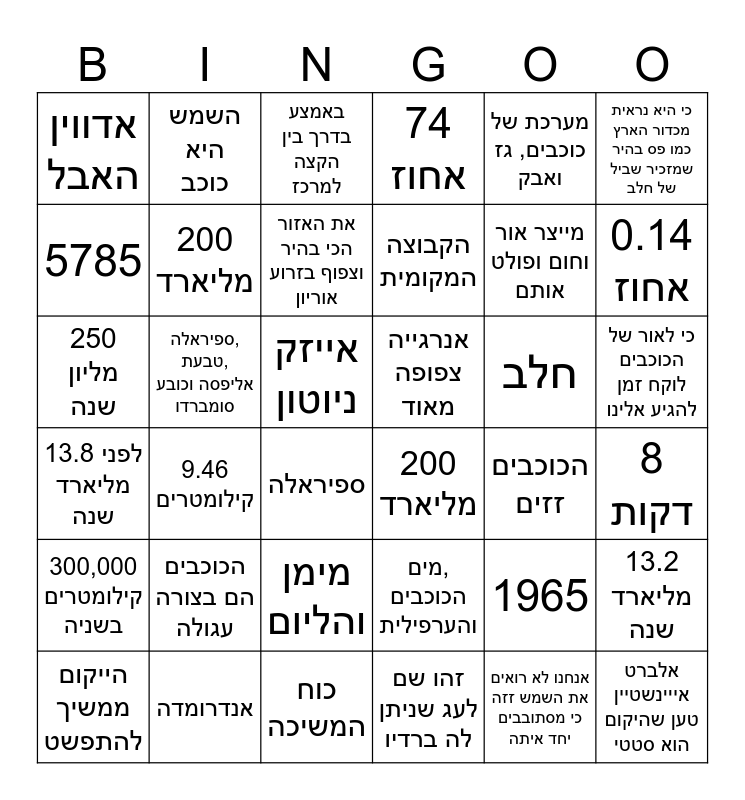 This bingo card has 36 words: מים, הכוכבים והערפילית, מימן והליום, זהו שם לעג שניתן לה ברדיו, 5785, לפני 13.8 מליארד שנה, אנרגייה צפופה מאוד, 200 מליארד, כוח המשיכה, מערכת של כוכבים, גז ואבק, 1965, 0.14 אחוז, 74 אחוז, 13.2 מליארד שנה, ספיראלה, טבעת, אליפסה וכובע סומברדו, הקבוצה המקומית, אדווין האבל, 300,000 קילומטרים בשניה, חלב, 250 מליון שנה, באמצע בדרך בין הקצה למרכז, אייזק ניוטון, 9.46 קילומטרים, 200 מליארד, ספיראלה, הכוכבים זזים, השמש היא כוכב, מייצר אור וחום ופולט אותם, אנדרומדה, את האזור הכי בהיר וצפוף בזרוע אוריון, כי היא נראית מכדור הארץ כמו פס בהיר שמזכיר שביל של חלב, אלברט אייינשטיין טען שהיקום הוא סטטי, הייקום ממשיך להתפשט, 8 דקות, כי לאור של הכוכבים לוקח זמן להגיע אלינו, הכוכבים הם בצורה עגולה and אנחנו לא רואים את השמש זזה כי מסתובבים יחד איתה.