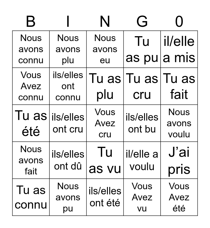 This bingo card has 85 words: Free!, J’ai eu, Nous avons eu, Tu as eu, Vous Avez eu, Il/Elle a eu, ils/elles ont eu, J’ai bu, Nous avons bu, Tu as bu, Vous avez bu, Il/Elle a bu, ils/elles ont connu, ils/elles ont bu, J’ai connu, Nous avons connu, Tu as connu, Vous Avez connu, Il/Elle a connu, J’ai cru, Nous avons cru, Tu as cru, Vous Avez cru, Il/Elle a cru, ils/elles ont cru, J’ai dû, Nous avons dû, Tu as dû, Vous Avez dû, Il/Elle a dû, ils/elles ont dû, J’ai été, Nous avons été, Tu as été, Vous Avez été, Il/Elle a été, ils/elles ont été, J’ai fait, Nous avons fait, Tu as fait, Vous Avez fait, il/elle a fait, ils/elles ont fait, J’ai lu, Nous avons lu, Tu as lu, Vous Avez lu, il/elle a lu, ils/elles ont lu, J’ai plu, Nous avons plu, Tu as plu, Vous Avez plu, il/elle a plu, ils/elles ont plu, J’ai pu, Nous avons pu, Tu as pu, Vous Avez pu, il/elle a pu, ils/elles ont pu, J’ai mis, Nous avons mis, Tu as mis, Vous Avez mis, il/elle a mis, ils/elles ont mis, J’ai pris, Nous avons pris, Tu as pris, Vous Avez pris, il/elle a pris, ils/elles ont pris, J’ai vu, Nous avons vu, Tu as vu, Vous Avez vu, il/elle a vu, ils/elles ont vu, J’ai voulu, Nous avons voulu, Tu as voulu, Vous Avez voulu, il/elle a voulu and ils/elles ont voulu.