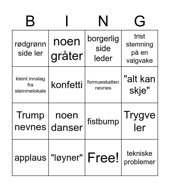This bingo card has 17 words: Free!, applaus, borgerlig side leder, rødgrønn side ler, noen danser, trist stemning på en valgvake, Trygve ler, formueskatten nevnes, "alt kan skje", konfetti, "løyner", fistbump, kleint innslag fra stemmelokale, noen gråter, Trump nevnes, "maktballanse" and tekniske problemer.