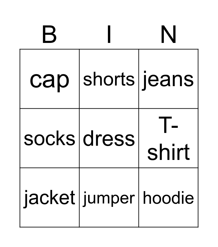 This bingo card has 9 words: jacket, jeans, shorts, socks, cap, T-shirt, dress, hoodie and jumper.