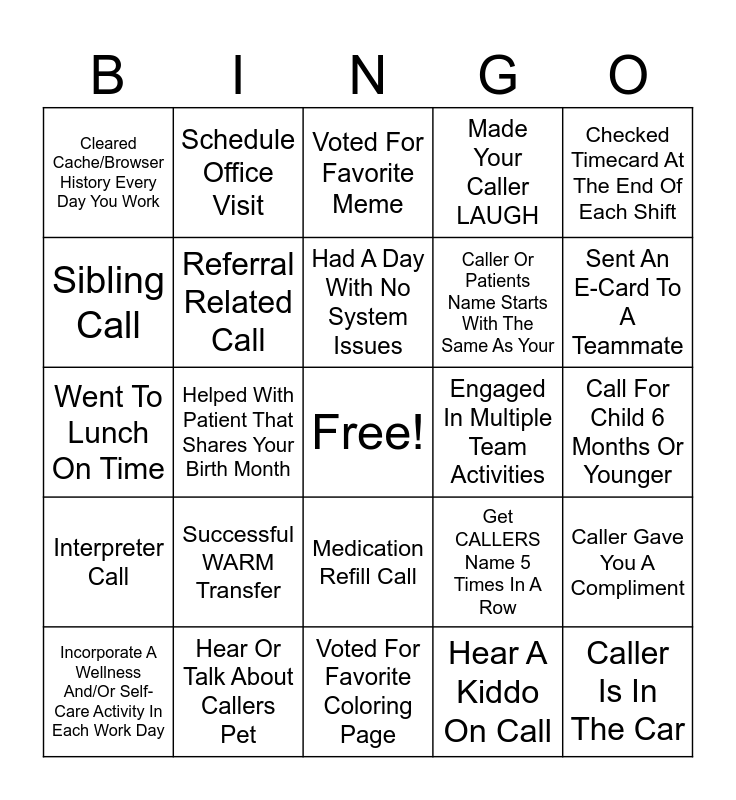 This bingo card has a free space and 24 words: Successful WARM Transfer, Hear Or Talk About Callers Pet, Had A Day With No System Issues, Incorporate A Wellness And/Or Self-Care Activity In Each Work Day, Checked Timecard At The End Of Each Shift, Cleared Cache/Browser History Every Day You Work, Sibling Call, Schedule Office Visit, Engaged In Multiple Team Activities, Medication Refill Call, Caller Or Patients Name Starts With The Same As Your, Went To Lunch On Time, Get CALLERS Name 5 Times In A Row, Caller Gave You A Compliment, Referral Related Call, Hear A Kiddo On Call, Call For Child 6 Months Or Younger, Voted For Favorite Meme, Sent An E-Card To A Teammate, Helped With Patient That Shares Your Birth Month, Caller Is In The Car, Interpreter Call, Made Your Caller LAUGH and Voted For Favorite Coloring Page.